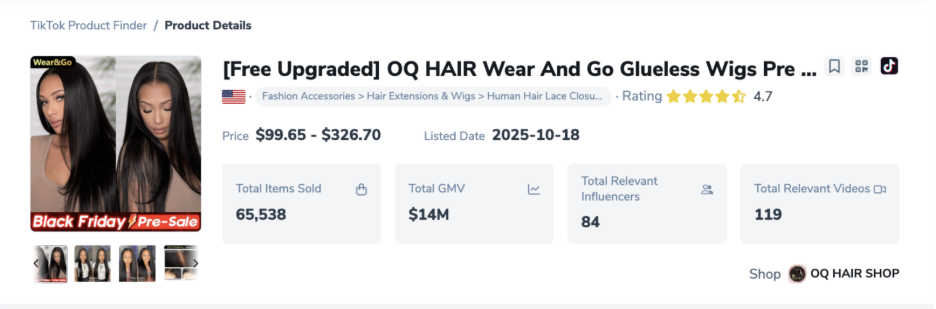 20. OQ Hair Wear and Go Glueless Wigs — $13,971,063